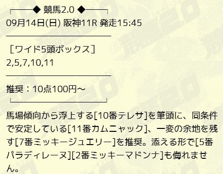 競馬2.0では、無料予想にも最新AIを使用し、毎週末に中央競馬の無料予想を提供してくれます。