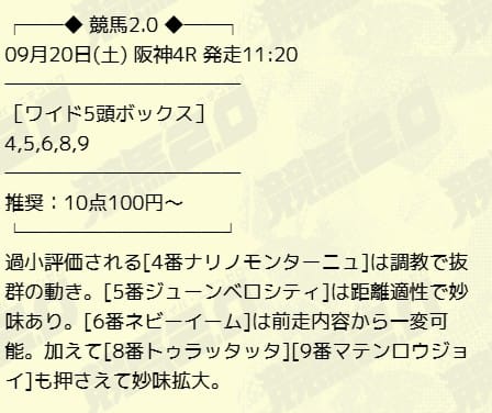 | 9月20日 | 阪神4R | 6,100円的中 |