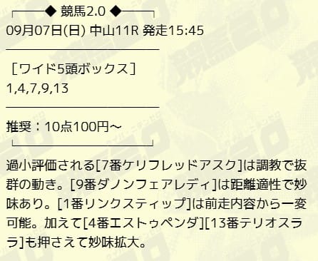 | 9月7日 | 中山11R | 23,200円的中 |
