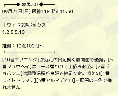 | 9月21日 | 阪神11R | 6,400円的中 |
