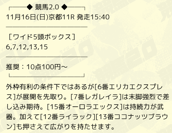 | 11月16日 | 京都11R | 9,500円的中 |