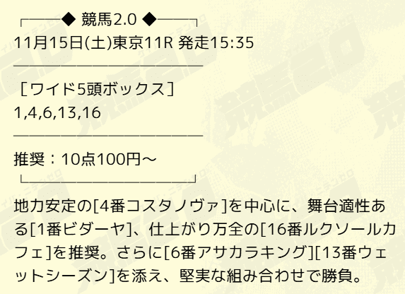 | 11月15日 | 東京11R | 22,500円的中 |