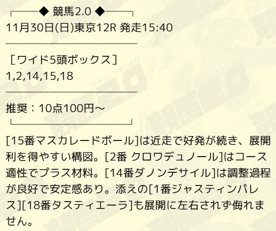 | 11月30日 | 東京12R | 3,200円的中 |