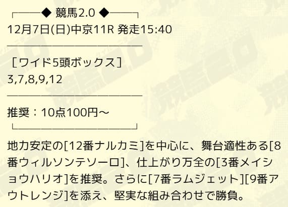 | 12月7日 | 中京11R | 10,100円的中 |