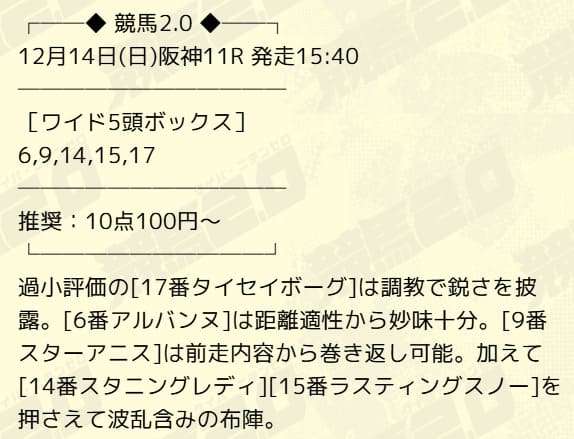 | 12月14日 | 阪神11R | 8,300円的中 |