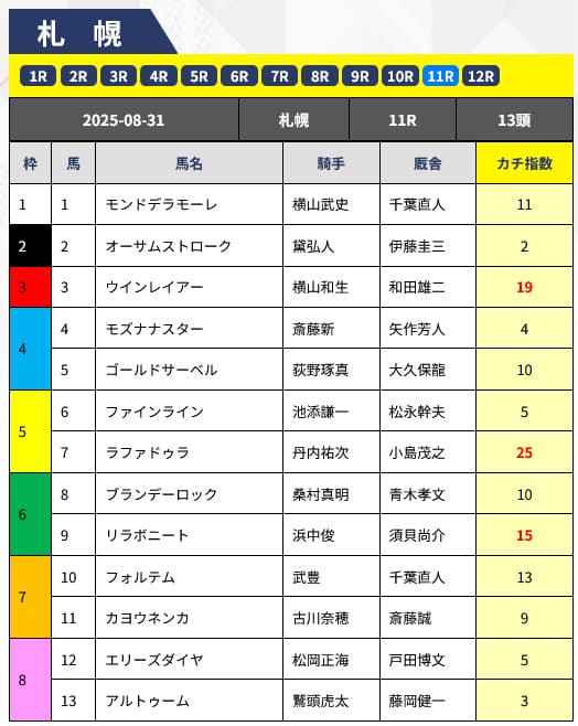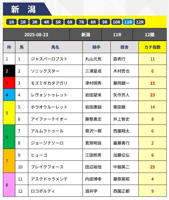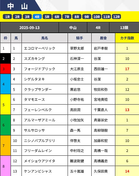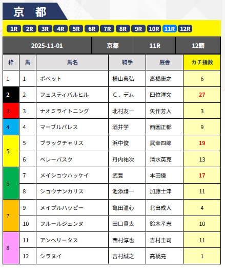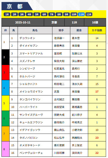 今回は、4番のシュヴァリエローズ、13番のシルブロン、1番のダンディズム、8番のウェルカムニュース、7番のメイショウブレゲが指数上位5頭です。