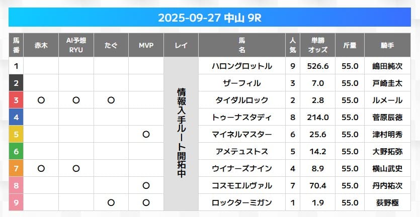 2つ以上の予想印が集まっているのは、1番のスナークステージ、4番のボニンブルー、9番のラブリーテン、10番のフィールマイヘヴンでした。