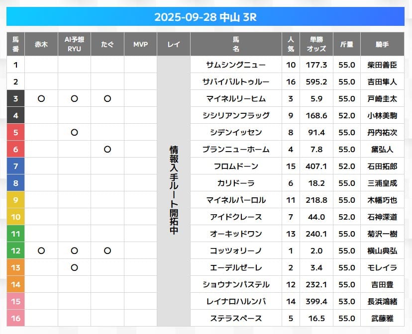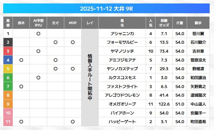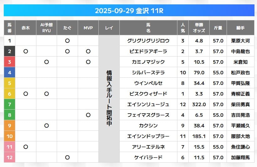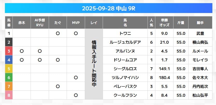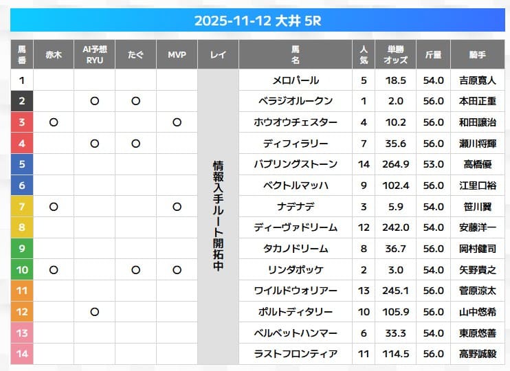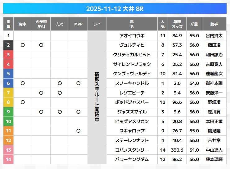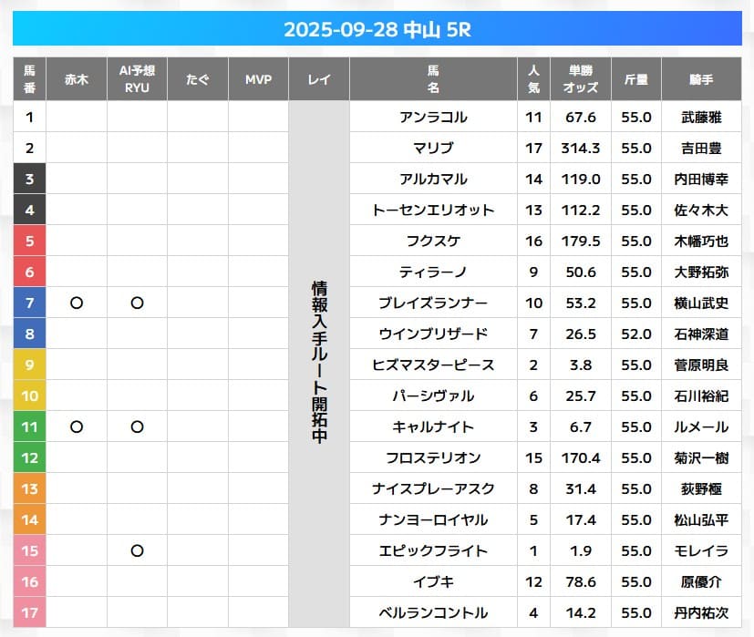 2つ以上の予想印が集まっているのは、2番のラティサワー、4番のイマヲトキメク、5番のザオ、8番のホワイトヘッドでした。
