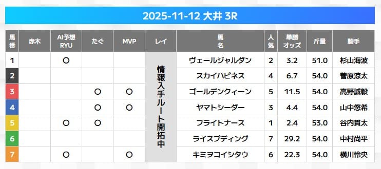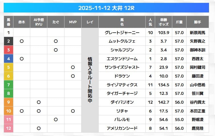 2つ以上の予想印が集まっているのは、1番のナムラダリウス、3番のレターマン、4番のヘリオシース、7番のタカラアーサー、12番のスヴィルカーチでした。
