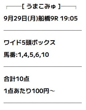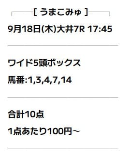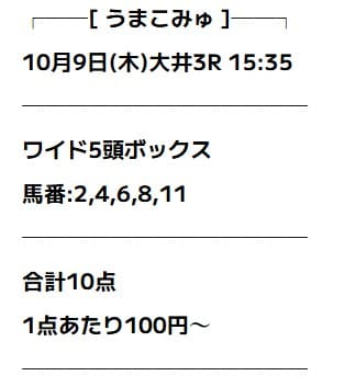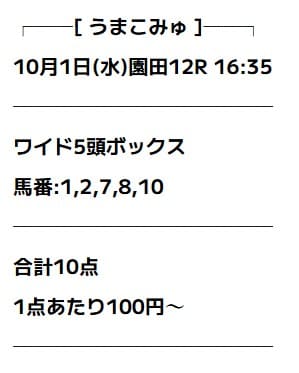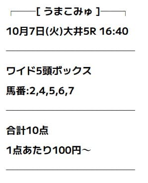 うまこみゅの無料予想では、ワイド5頭ボックスを公開しており、指定された買い目通りに購入するだけでOKです。